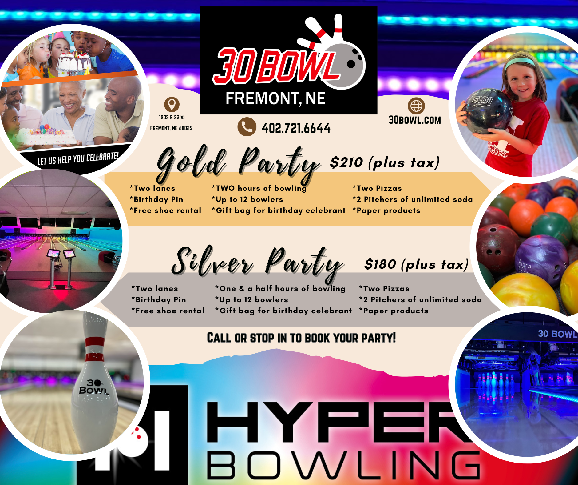Please go to our Web Reservation page to book your birthday party! Please call us at 402-721-6644 or email at mail@30bowl.com for any questions.
